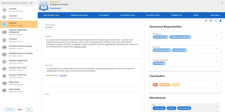 Use stewardship tools to develop a common business language and assign data assets with governance including business terms, policies, rules and more.